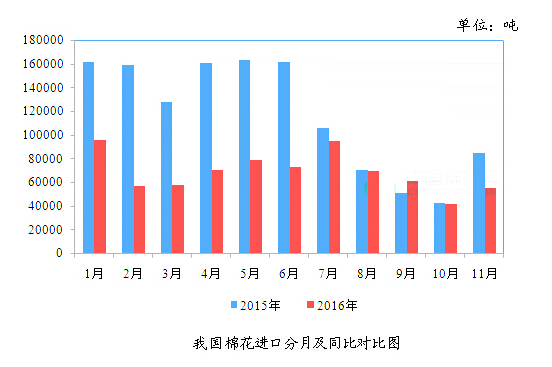 據(jù)中國海關(guān)總署統(tǒng)計,2016年11月,我國進口棉花5.50萬噸,環(huán)比增加1.36萬噸,增幅32.99%;同比減少2.95萬噸,減幅34.92%;2016年1-11月,我國累計進口棉花75.12萬噸,同比減少53.47萬噸,減幅41.58%。2016/2017年度,我國累計進口棉花15.70萬噸,同比減少2.06萬噸,減幅11.59%。